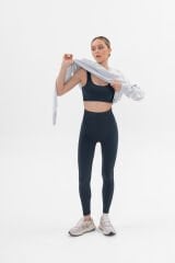 Power Rib Dikişsiz Kadın Spor Takım (Üst + Yüksek Bel Tayt) Mavi Grafit